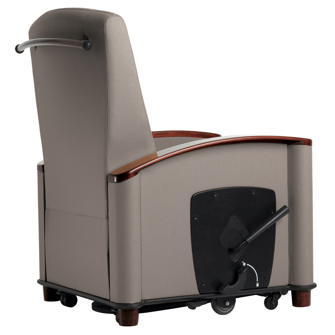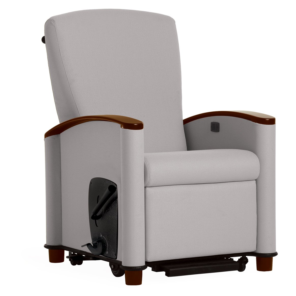 - A single point ottoman handle/caster brake is recessed to minimize damage to the recliner and facility